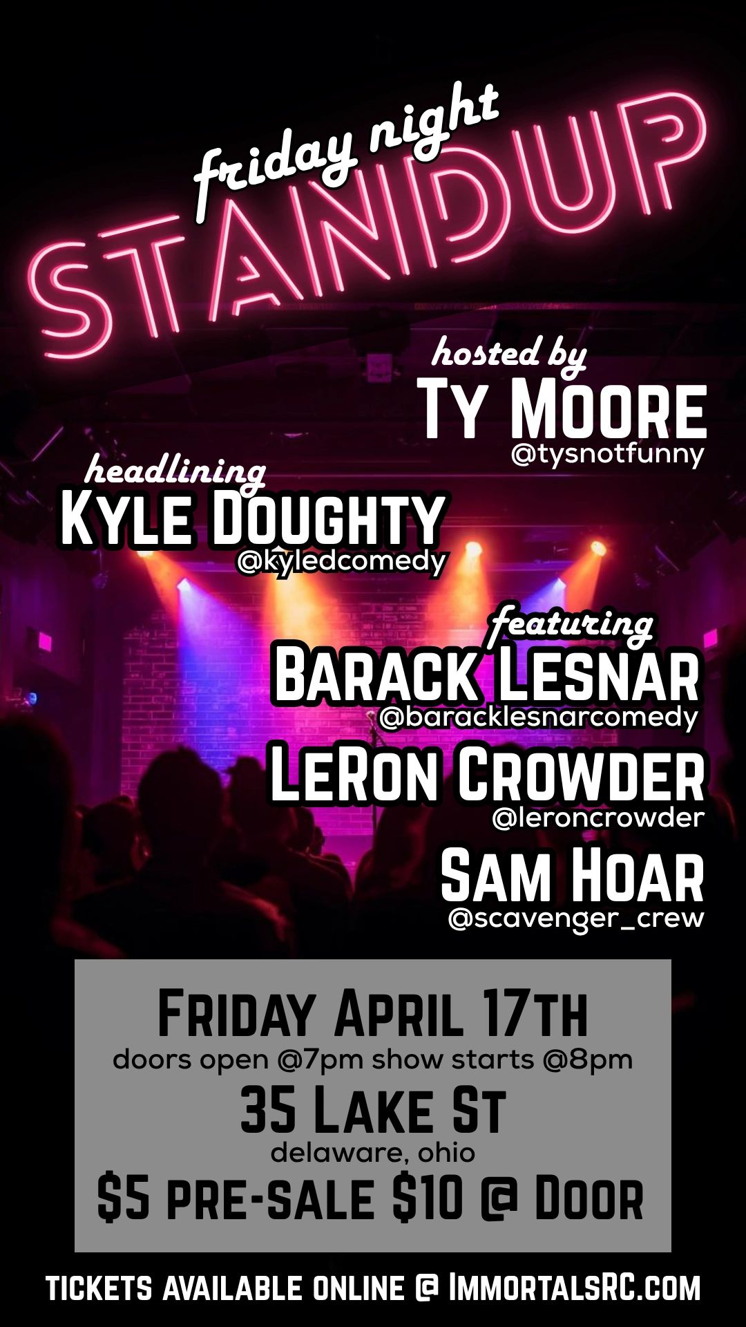 Host Ty Moore is joined by headliner Kyle Doughty and comics Barack Lesnar, LeRon Crowder, and Sam Hoar for a night of laughs.